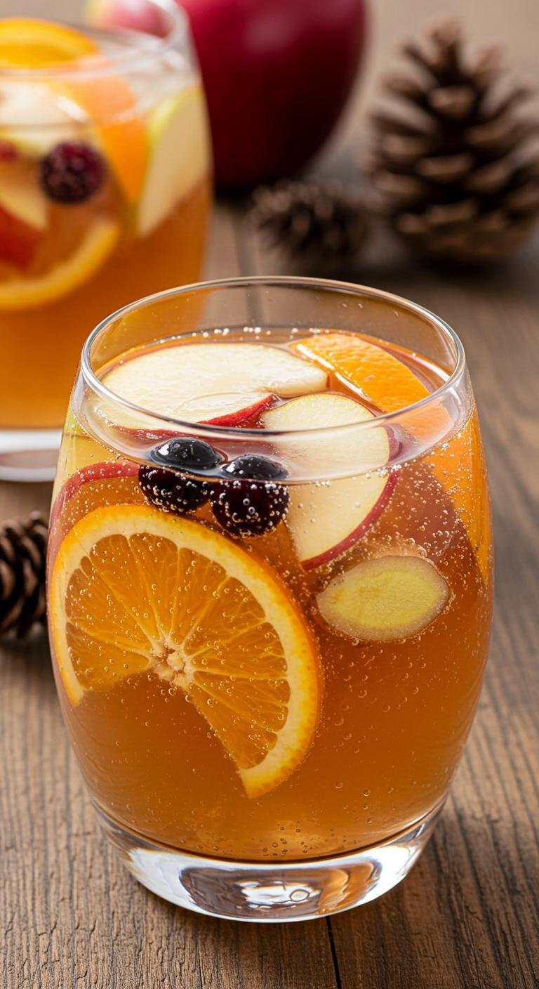 - Combine sparkling white wine, apple cider, and honey in a pitcher.