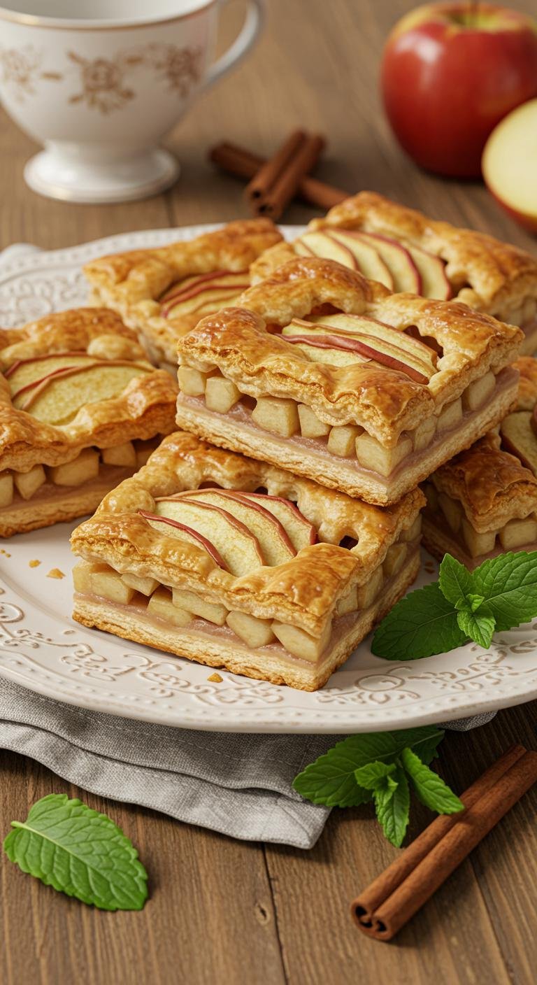 - Layer apples with sugar and cinnamon, cover with another layer of pastry, and brush with egg before baking for 20-25 minutes.