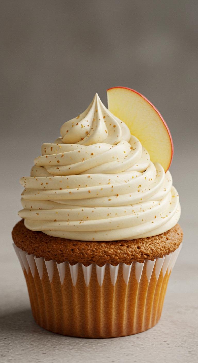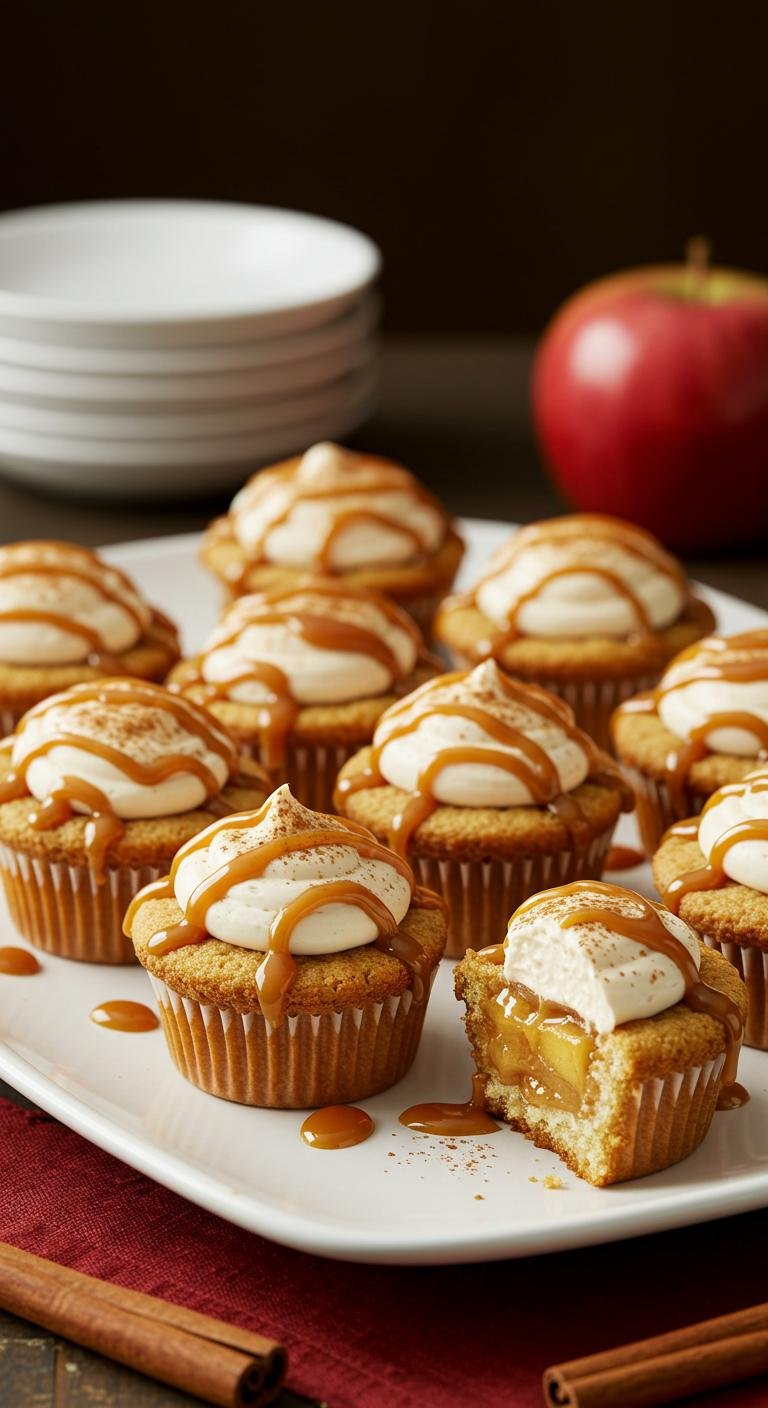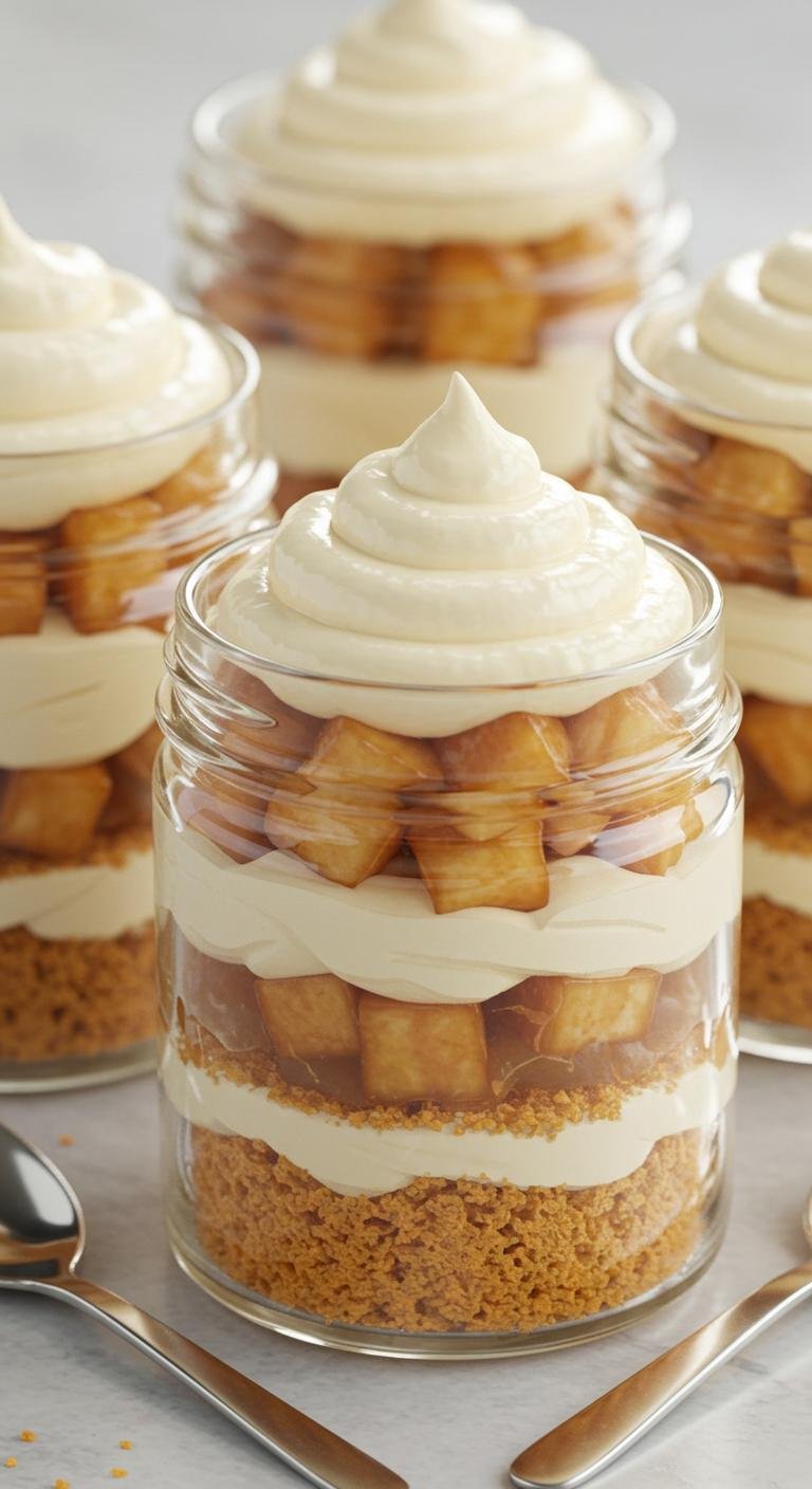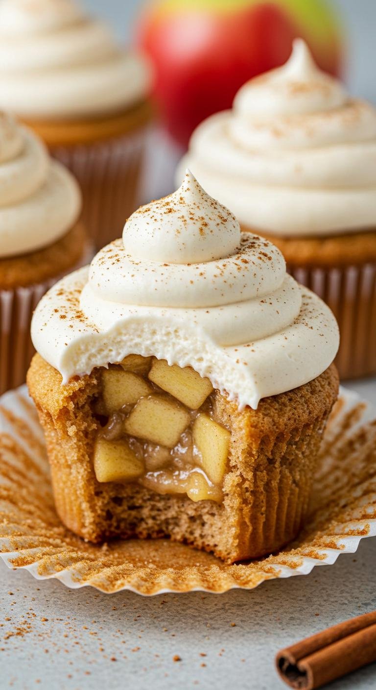- Crumble cupcakes into jars, layer with apple filling, and top with cream cheese frosting.