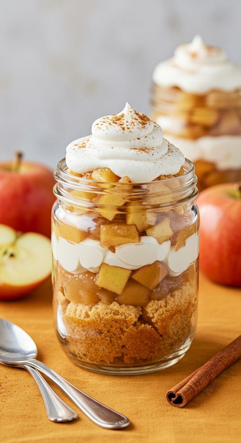 - Layer cupcake pieces, apple filling, and whipped cream in jars.