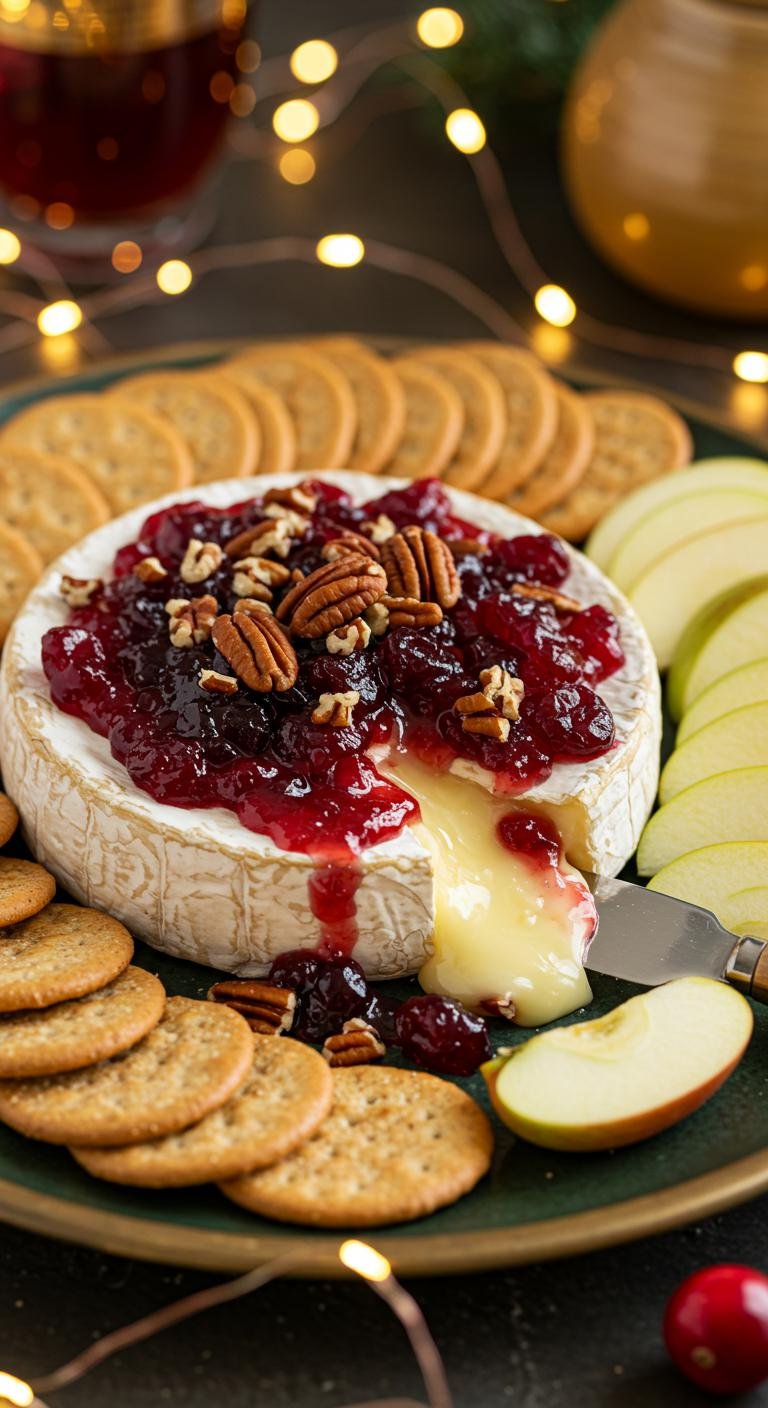 - Spread cranberry sauce over the Brie, then top with pecans.