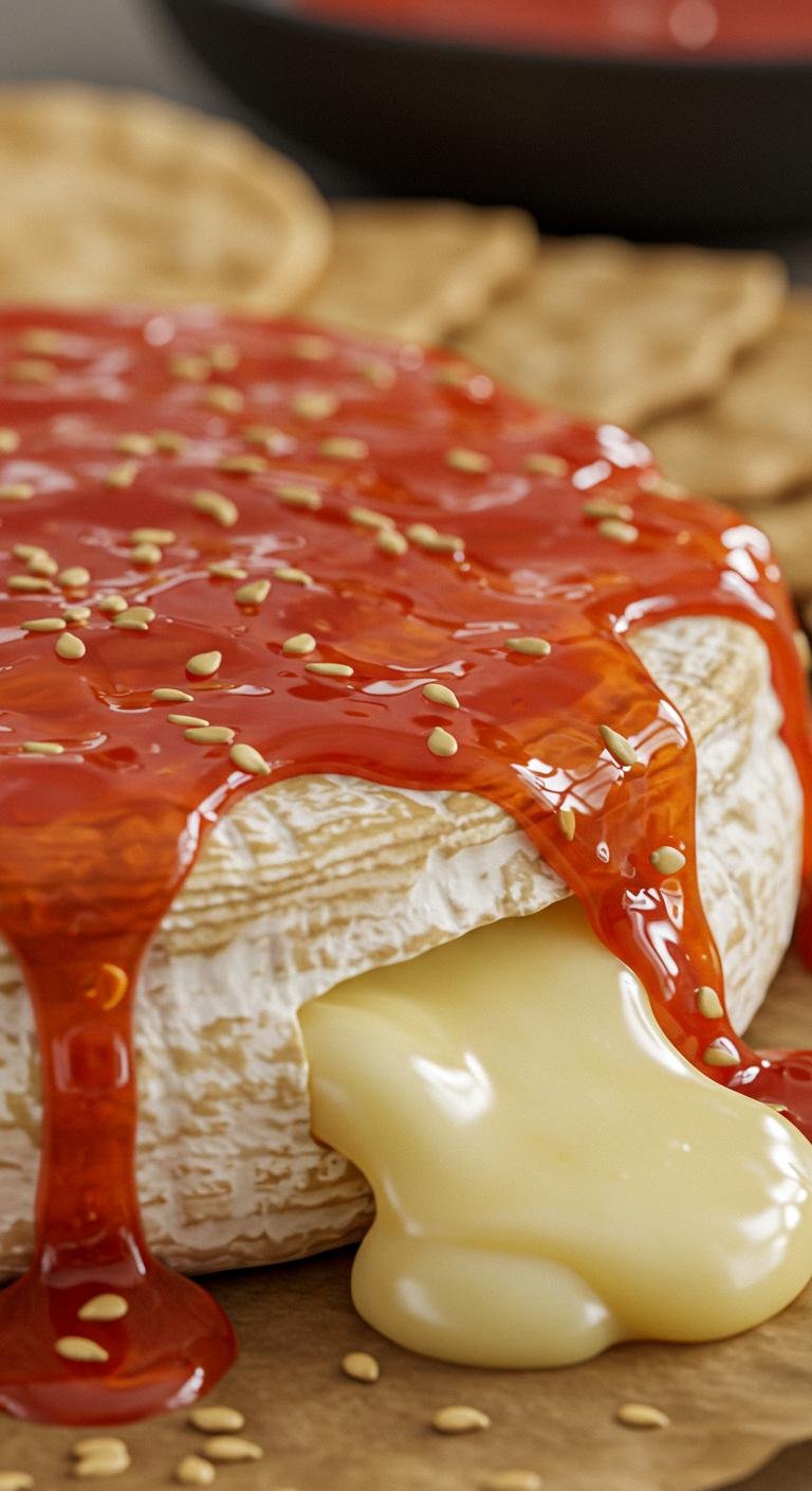 - Spread Sriracha on Brie and sprinkle with sesame seeds.
