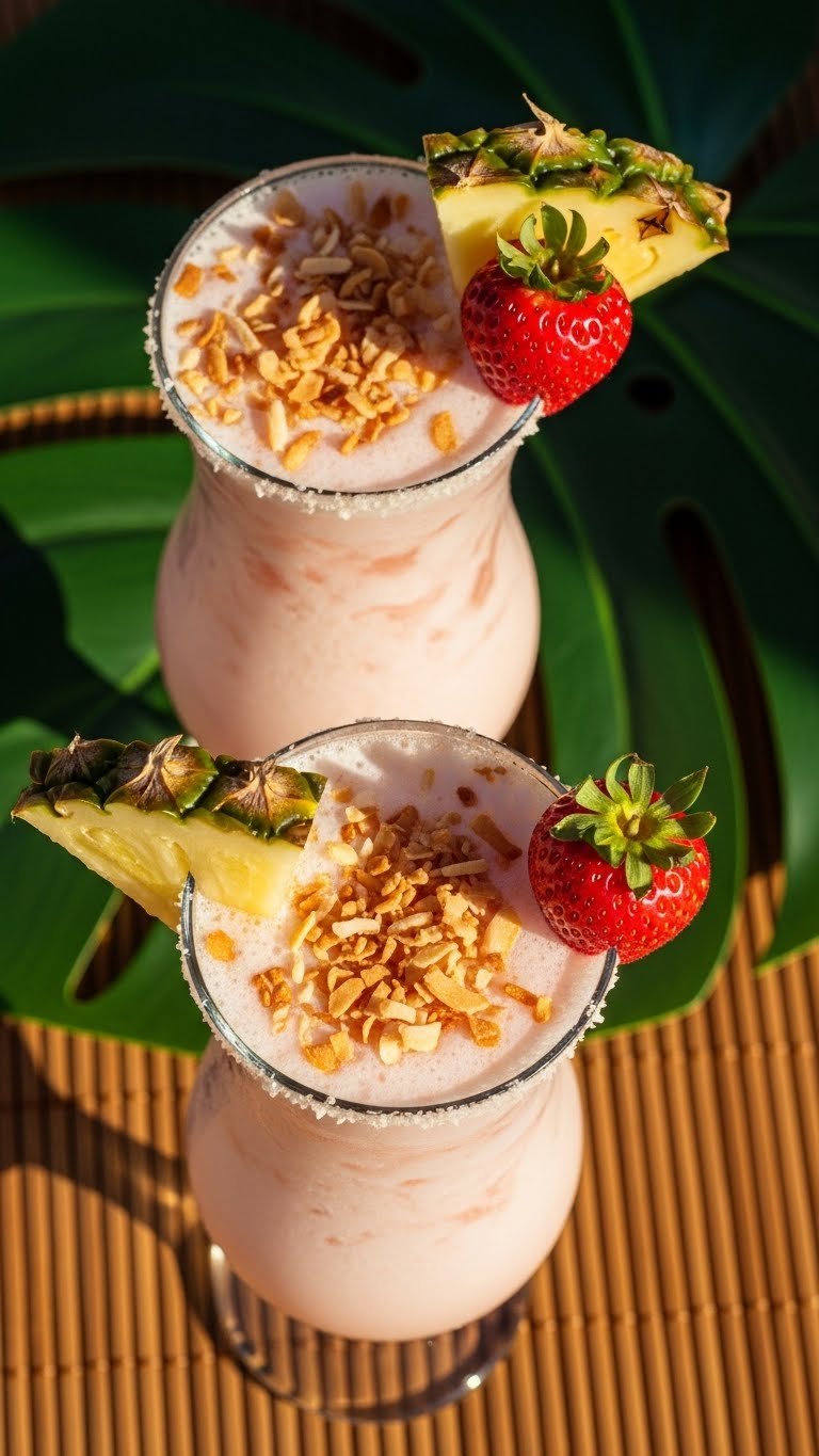 Serve in hurricane glasses with a pineapple wedge and strawberry. Rim with toasted coconut or sugar for texture. Pair with grilled shrimp or spicy tacos. Store coconut cream separately for up to 24 hours; blend fresh before serving. Make ahead by freezing blended mix in ice cube trays for mini daiquiris.