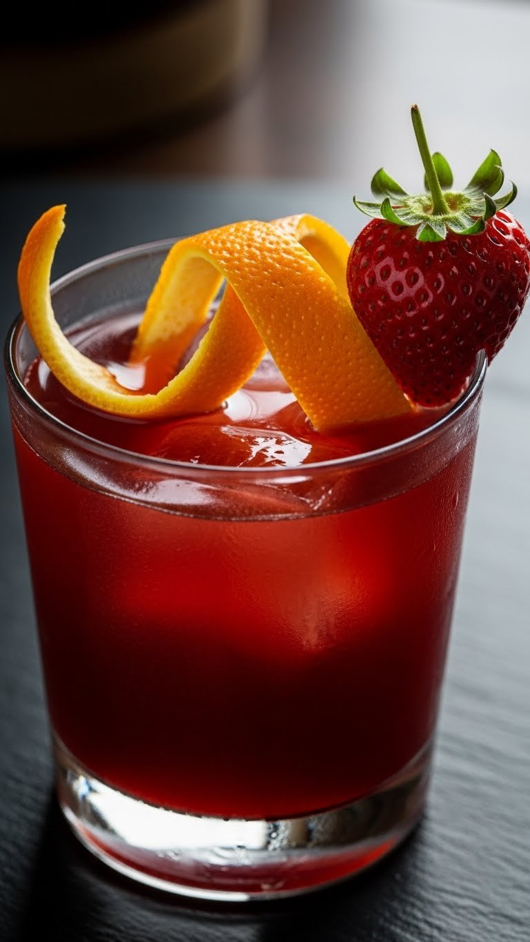 - Garnish with orange peel and strawberry. Let sit 1 minute.