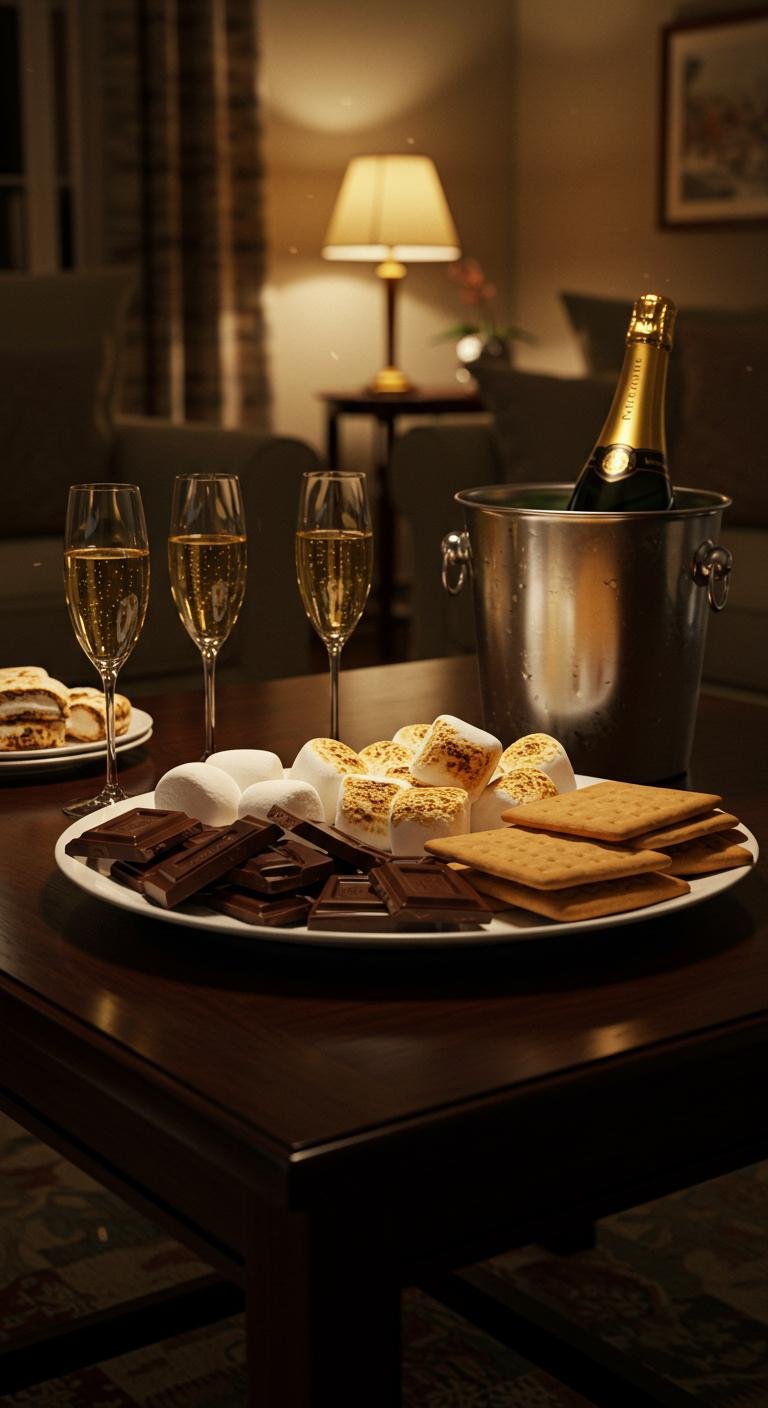 - Assemble s’mores with chocolate and crackers, adding a splash of champagne.