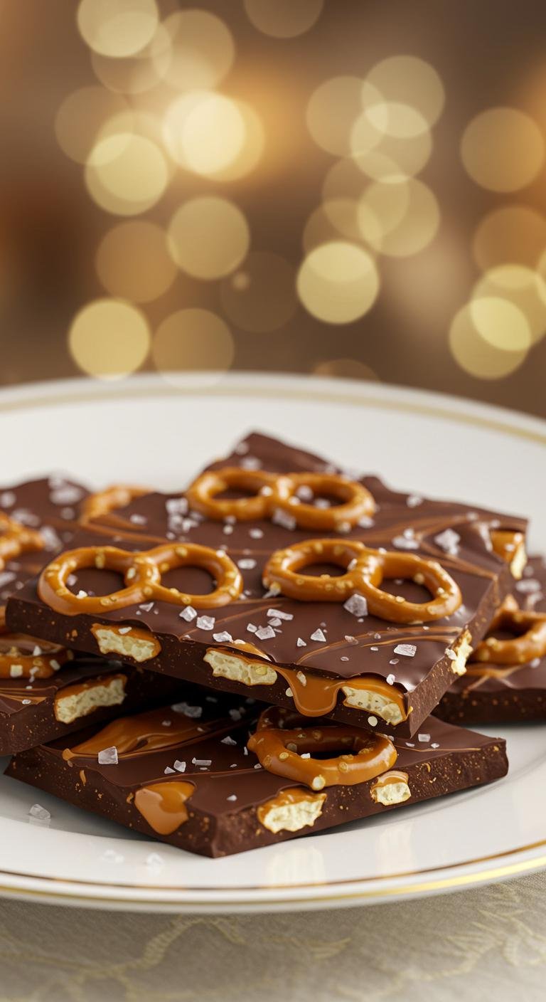 - Top with pretzel pieces and caramel bits, pressing them in slightly.