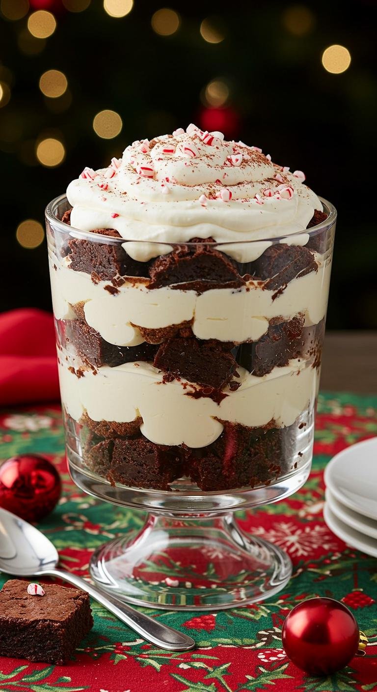 - Cut brownies into pieces and layer them in a glass dish with whipped cream and crushed peppermint.