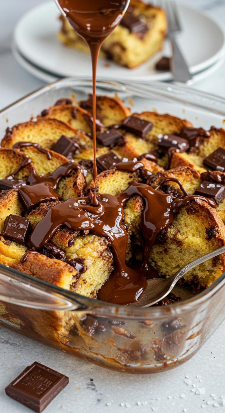 - Whisk half-and-half, eggs, sugar, and vanilla. Stir in bread and chocolate chips.