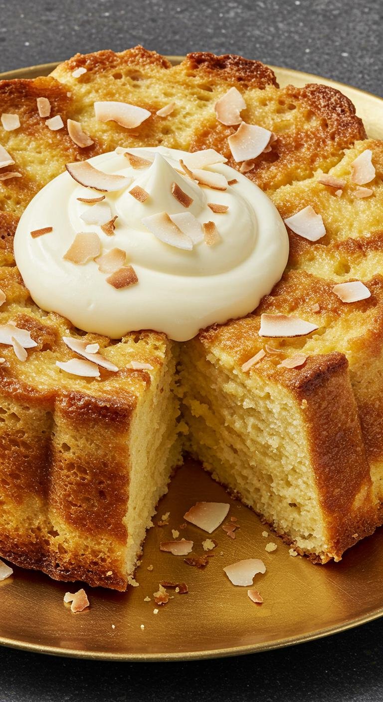- Mix coconut milk, eggs, sugar, and vanilla. Stir in bread and coconut.