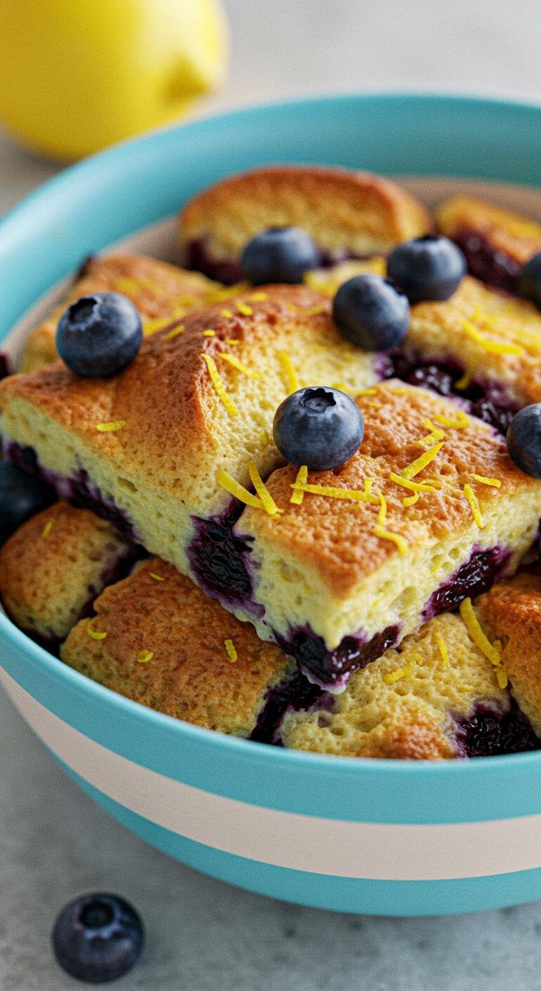 - Whisk milk, eggs, sugar, and lemon zest. Fold in bread and blueberries.