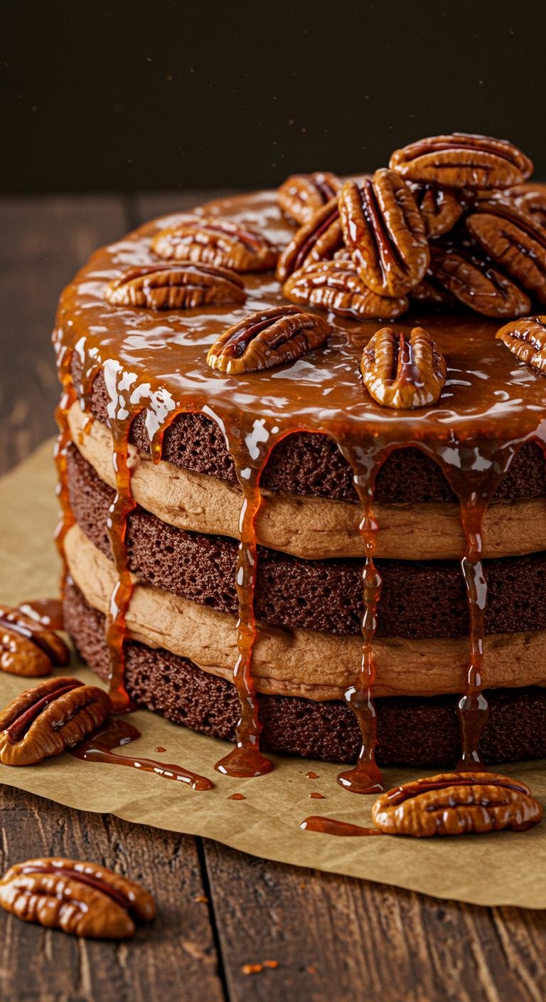 - Bake for 30-35 minutes. Cool and top with a caramel glaze and whole pecans.