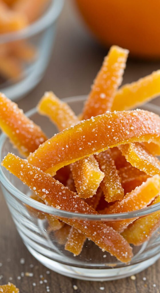 - Make a syrup with sugar and water, then simmer peels until translucent.