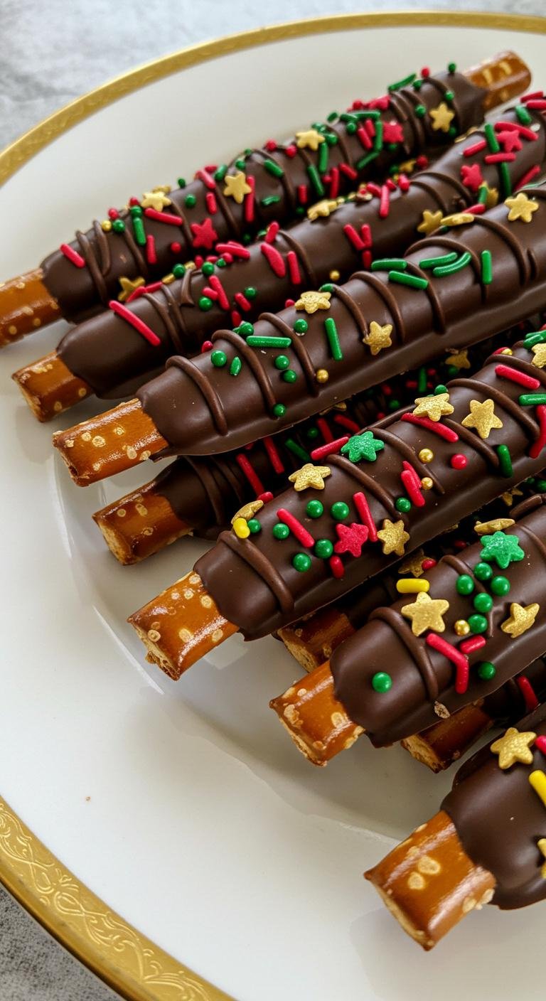 - Dip pretzel rods in chocolate and sprinkle with festive toppings.