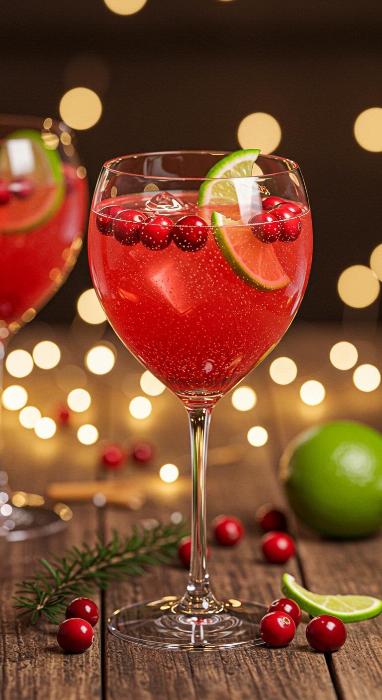 - Pour into glasses and add fresh cranberries and lime slices on top.