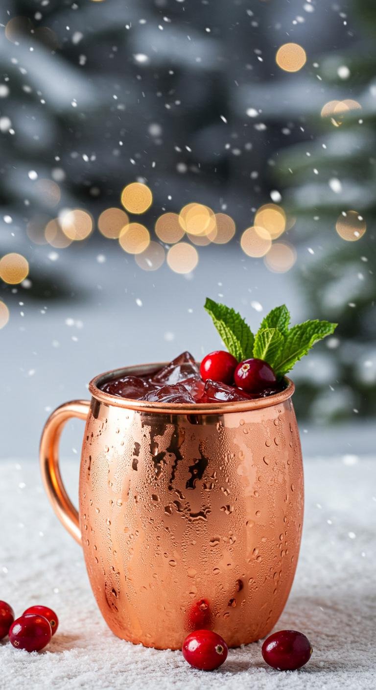 - Fill a copper mug with ice and add vodka and cranberry juice.