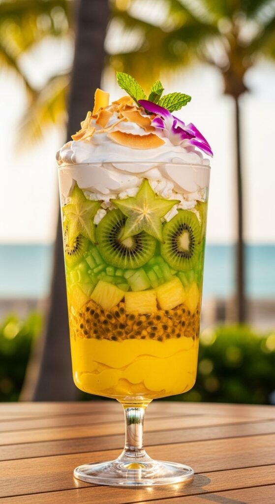 - Repeat layers, topping with toasted coconut flakes.