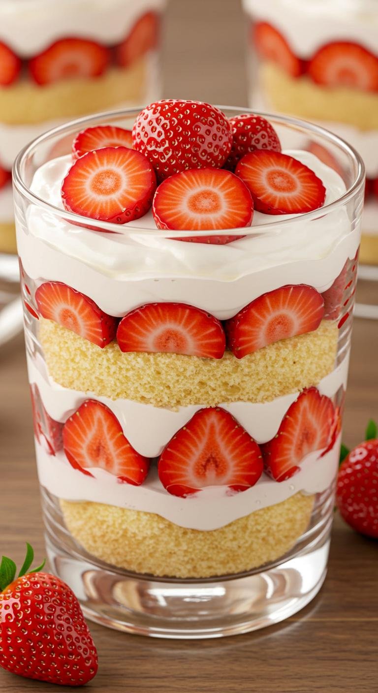- Layer sponge cake cubes and strawberries at the bottom.
