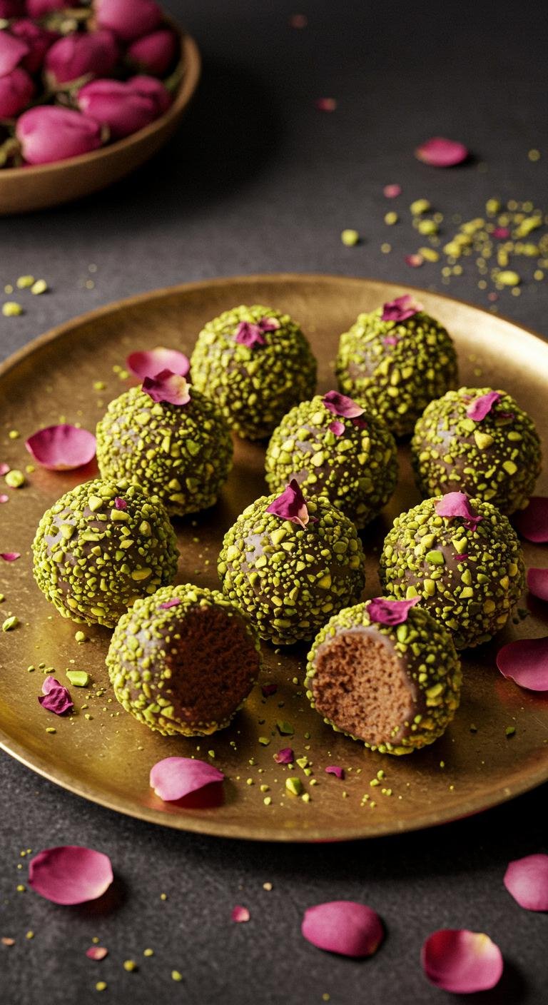 - Roll in crushed pistachios and top with rose petals.