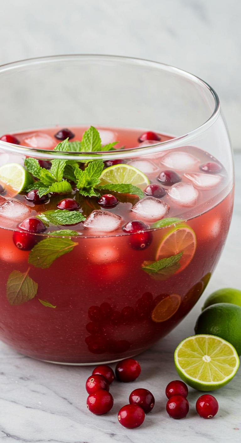 - Mix cranberry juice, lime juice, and mint syrup in a large bowl.