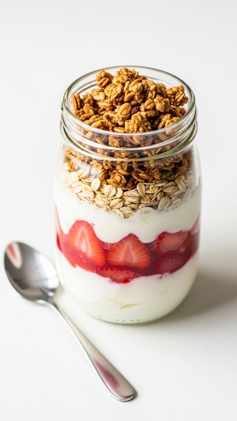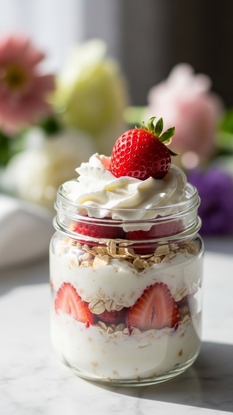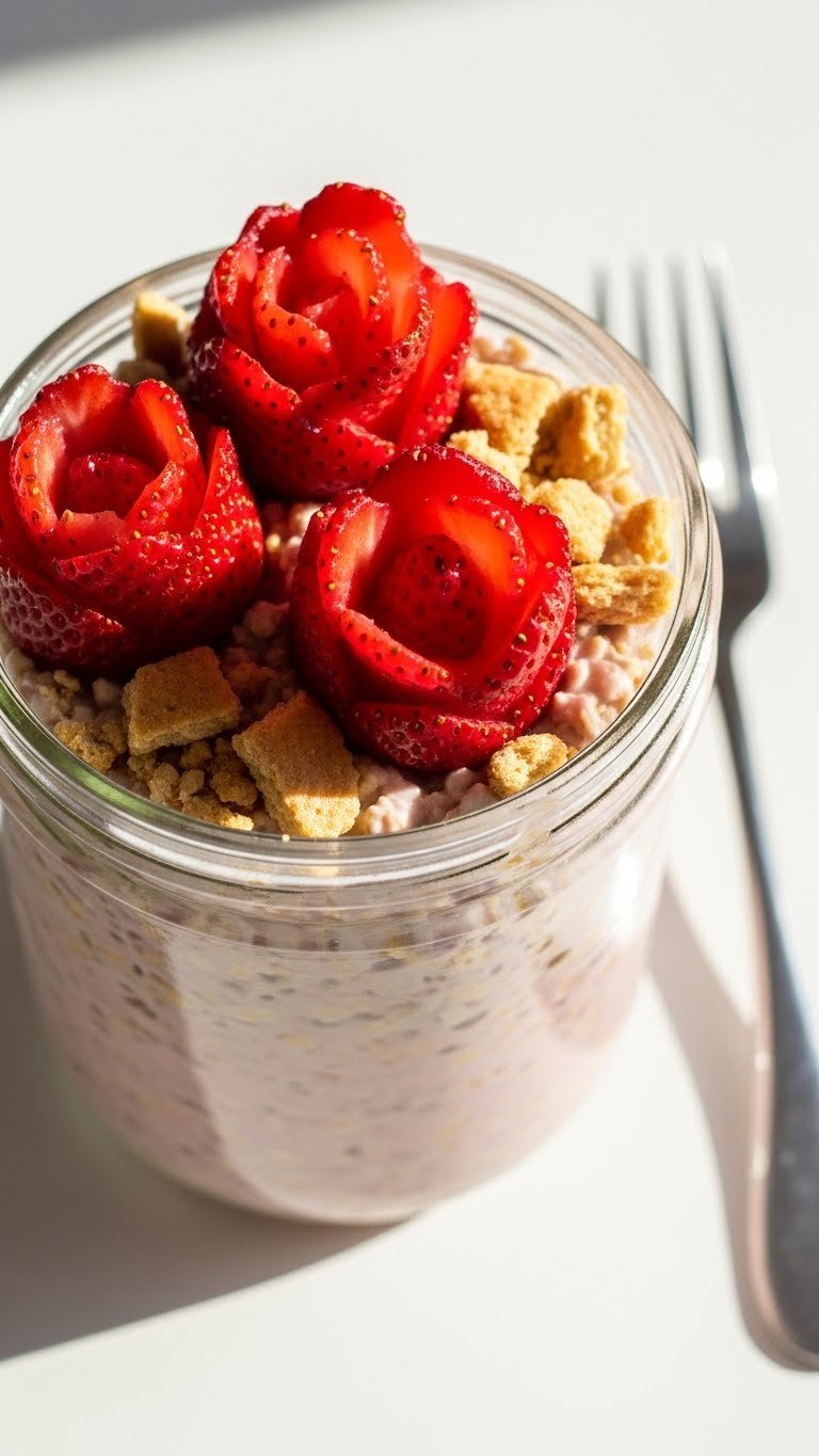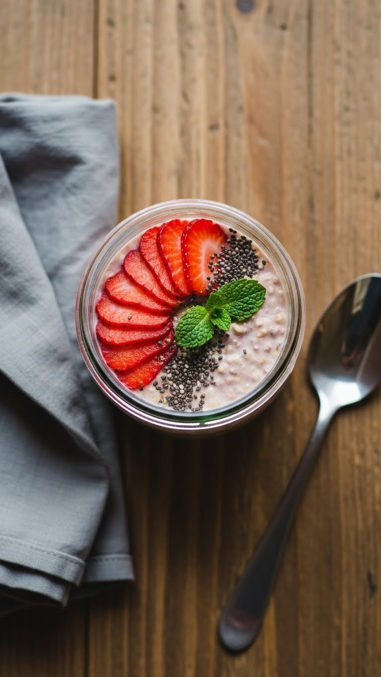 Serve in the jar or spoon into a bowl. Garnish with fresh strawberry halves and mint. Pair with a hot coffee or green tea and a hard-boiled egg for protein. Store sealed in the fridge up to 3 days. For travel, keep chilled in an insulated bag. Make a batch of jars for weekday breakfasts.