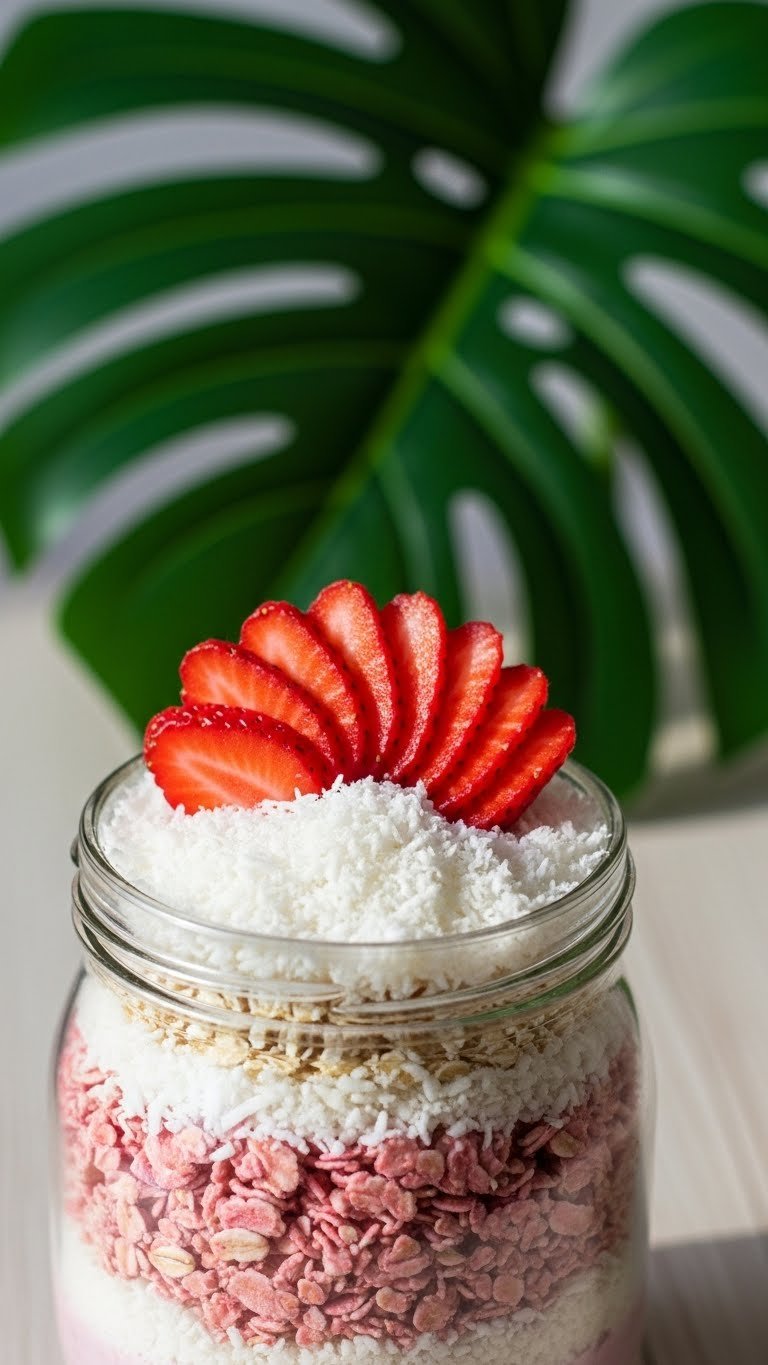 Serve with a sprinkle of extra coconut and a strawberry half. Pair with black coffee or a mango smoothie. Store covered up to 3 days in the fridge. For a creamier result, use full-fat coconut milk and give jars a good stir before serving.