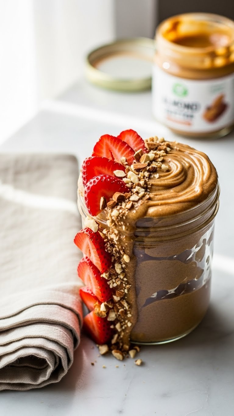 Serve with extra almond butter drizzle and strawberry slices. Pair with espresso or herbal tea. Store covered up to 3 days in the fridge. For on-the-go, keep jars upright in a cooler.