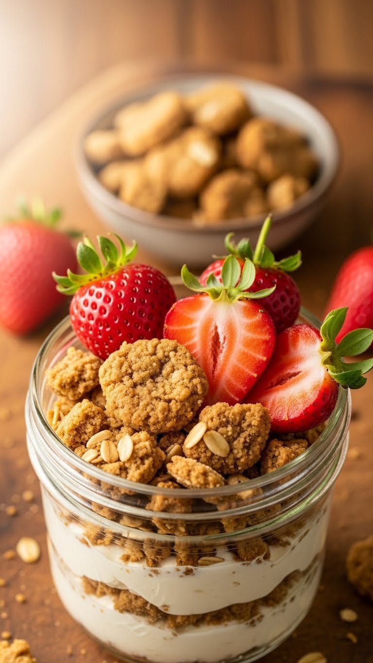 Spoon into a bowl and top with whole strawberry slices and cookie crumbs. Pair with a cinnamon latte or chai. Store sealed up to 3 days in the fridge. Make extra crumble topping to keep it crunchy longer.