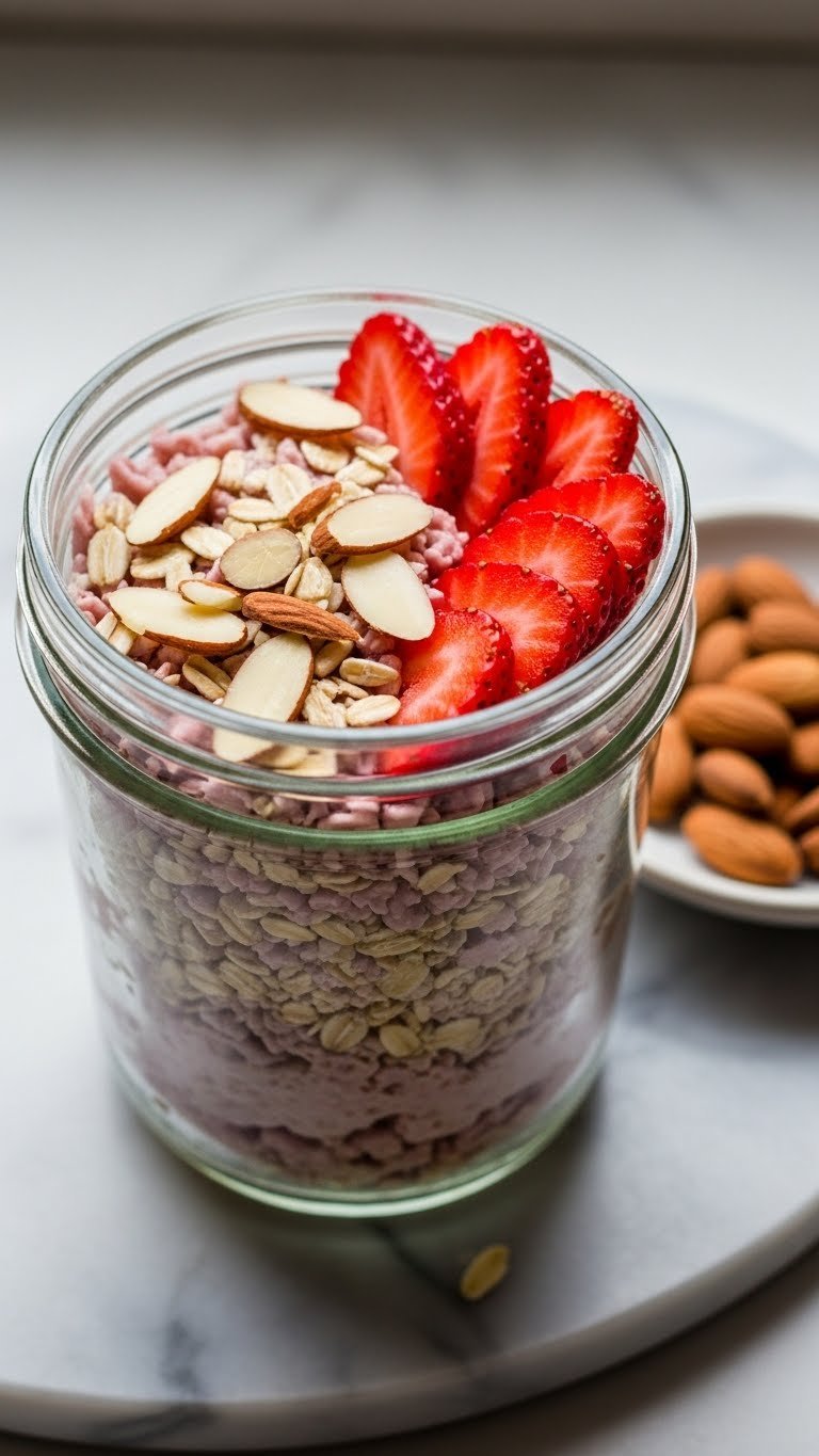 Almond milk, sliced almonds, and a hint of almond extract create a nut-forward strawberry overnight oats jar. It’s light, subtly sweet, and has crunch. Great for almond lovers and those who want a mild, elegant breakfast. You’ll notice toasted almond aroma and a clean, nutty finish.