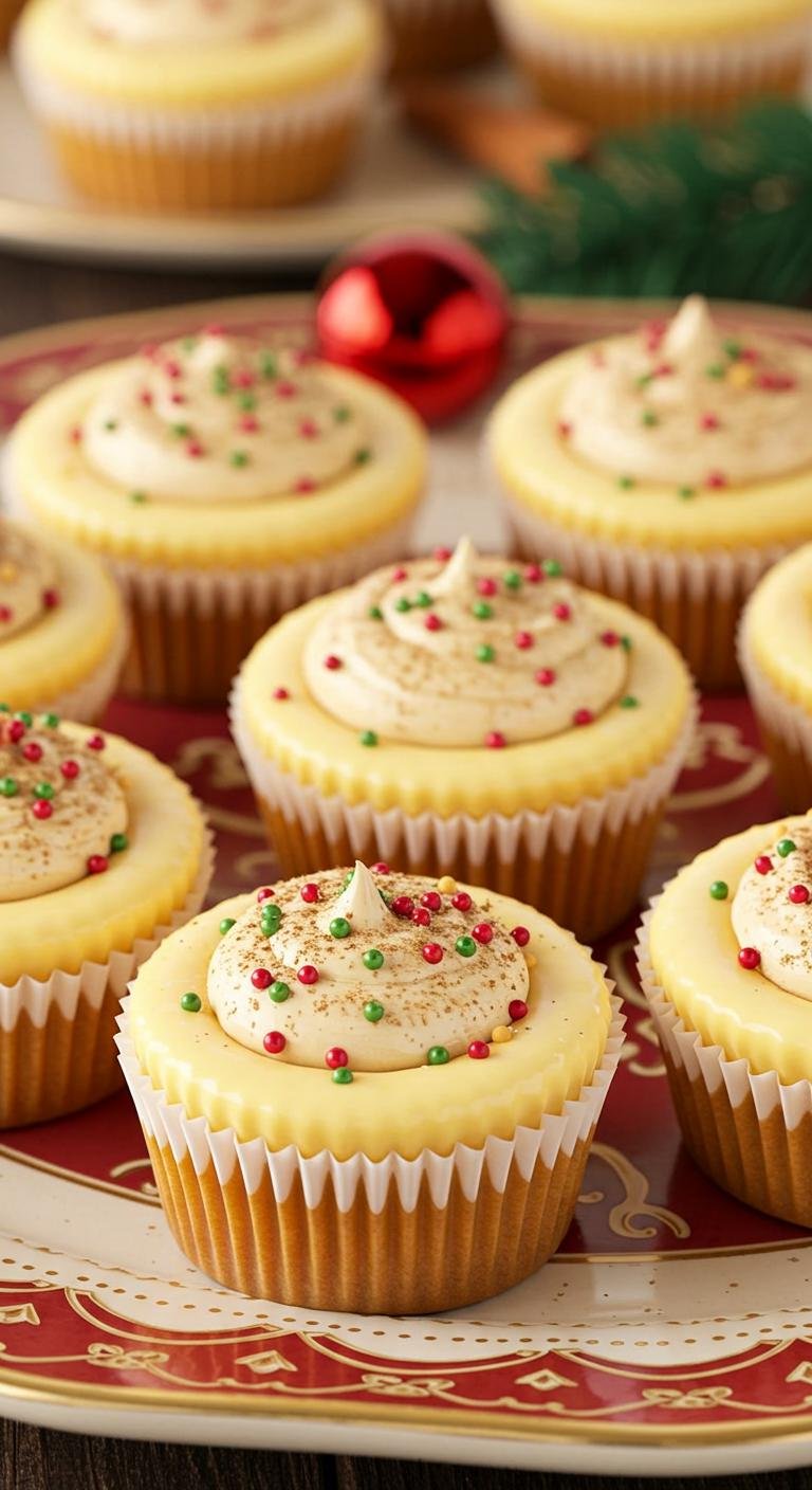 - Blend cream cheese, sugar, eggnog, and eggs, then fill liners and bake for 20 minutes.