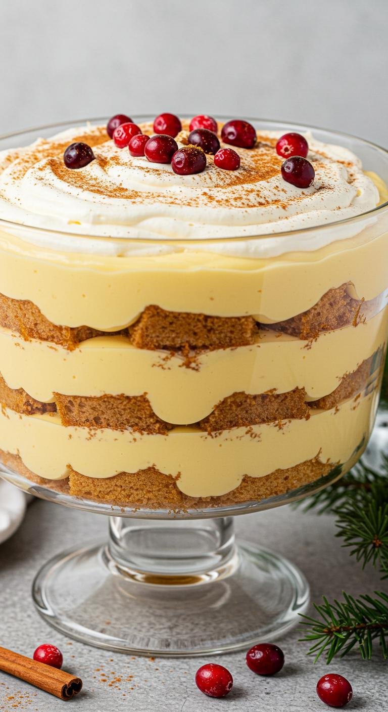 A festive dessert that layers the deliciousness of eggnog with seasonal fruits and whipped cream.