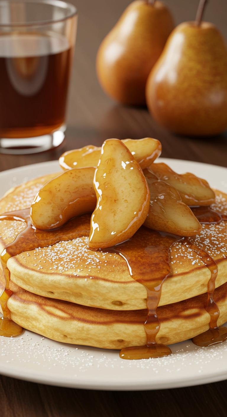 Treat yourself to eggnog pancakes paired with warm spiced pears for added flavor.