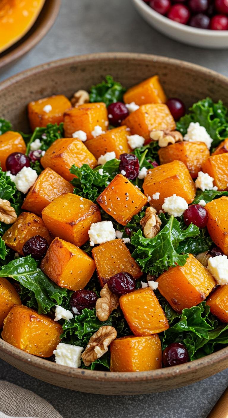 - In a large bowl, toss together kale, squash, cranberries, and walnuts.