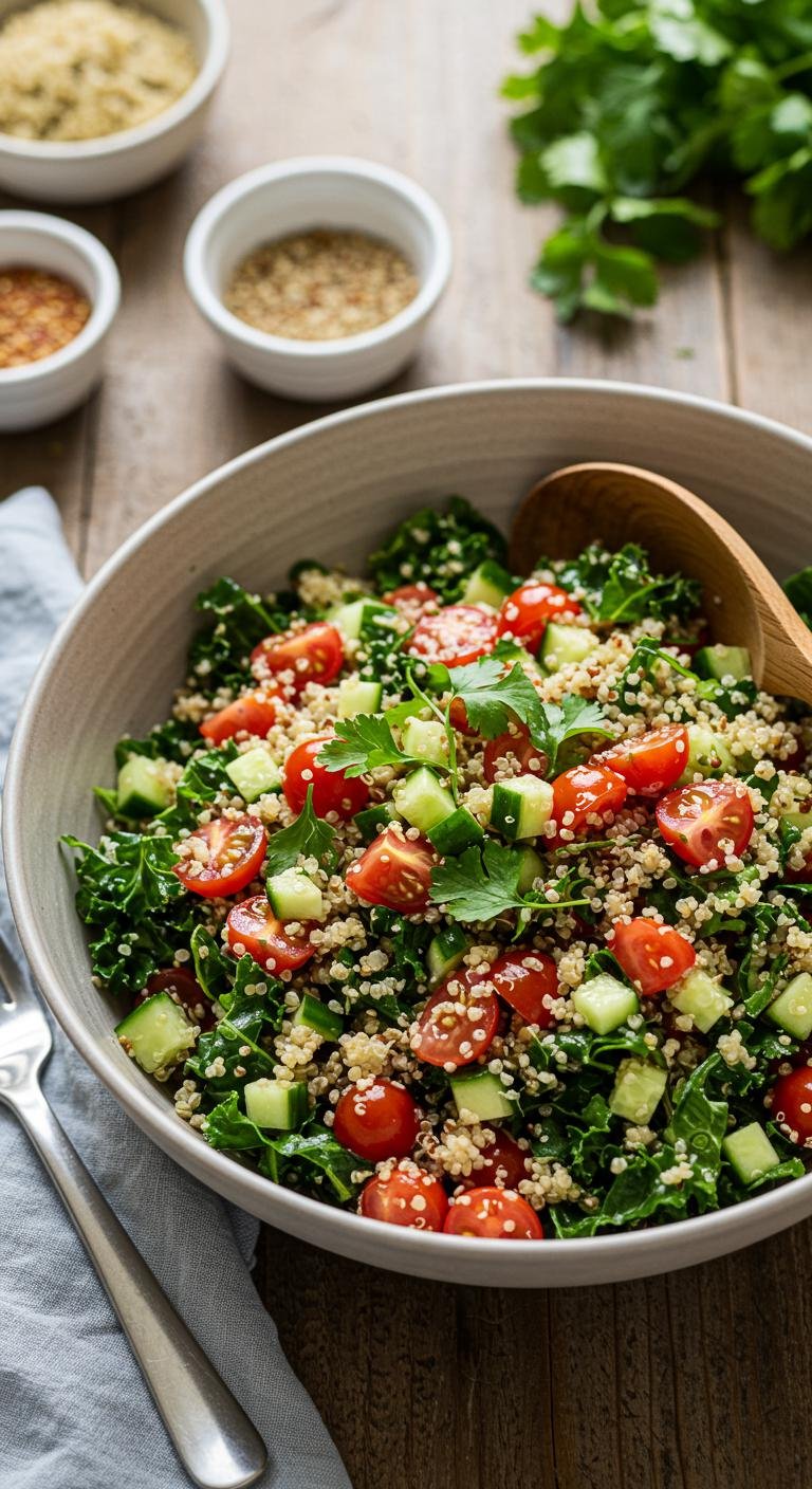 - In a bowl, mix cooked quinoa, kale, tomatoes, and cucumber.
