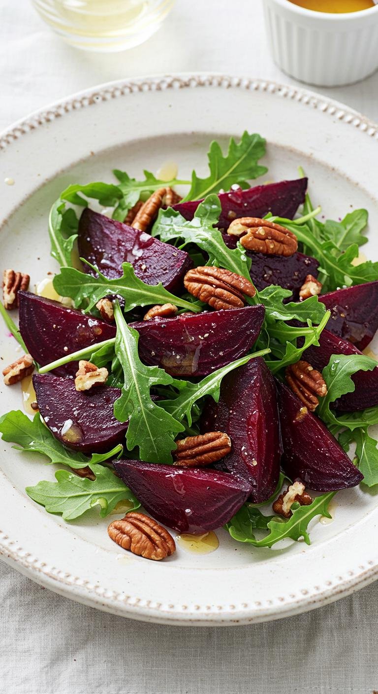 - In a salad bowl, arrange arugula, sliced beets, walnuts, and goat cheese.