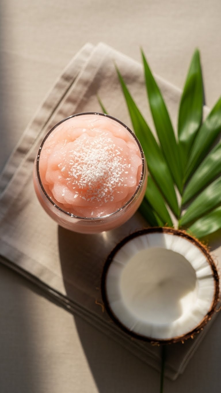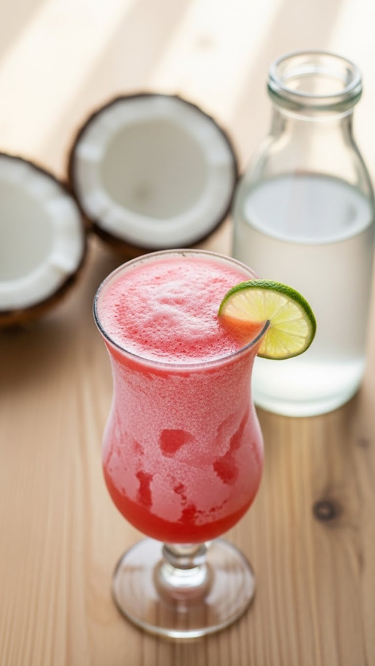 Serve in highball glasses with a lime wheel. Pair with grilled fish or tropical salads. Store leftovers for 12–24 hours in the freezer and reblend. Make-ahead: freeze coconut water in trays to keep texture crisp.