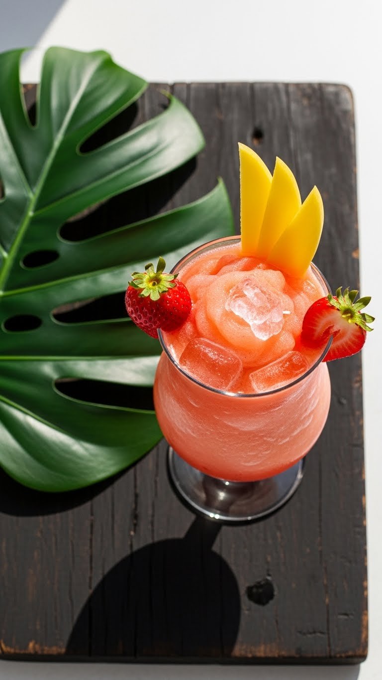 Serve in short tumblers or tiki mugs. Garnish with a small skewer of mango and strawberry. Pair with fish tacos or creamy grilled cheese. Freeze extra blended mix in an airtight container for up to 48 hours; reblend briefly before serving. Great for beach-themed parties.