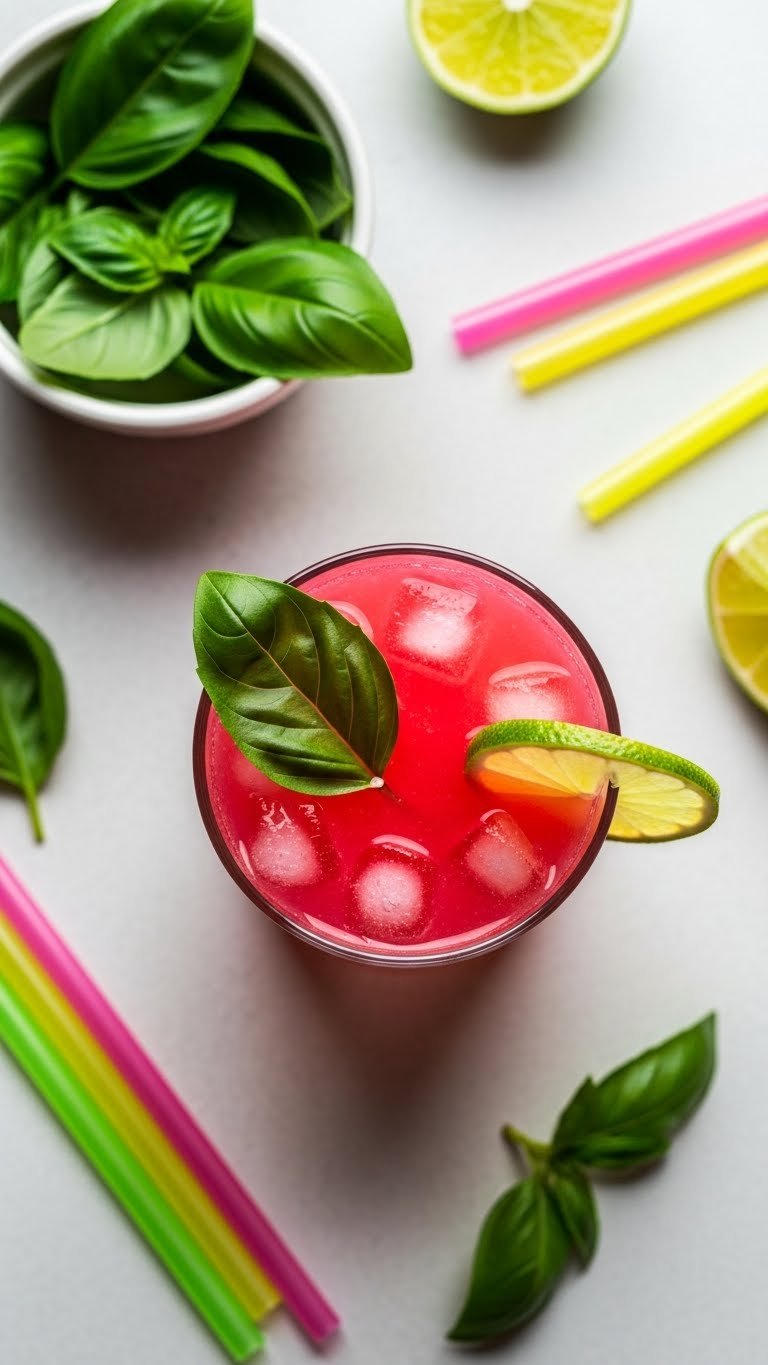 - Pour into glasses and garnish with basil and lime.