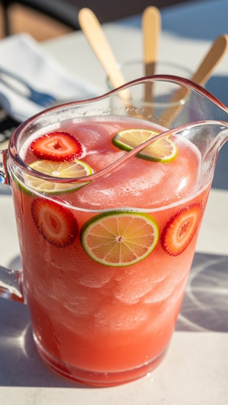 - Sliced strawberries and lime wheels for the pitcher
