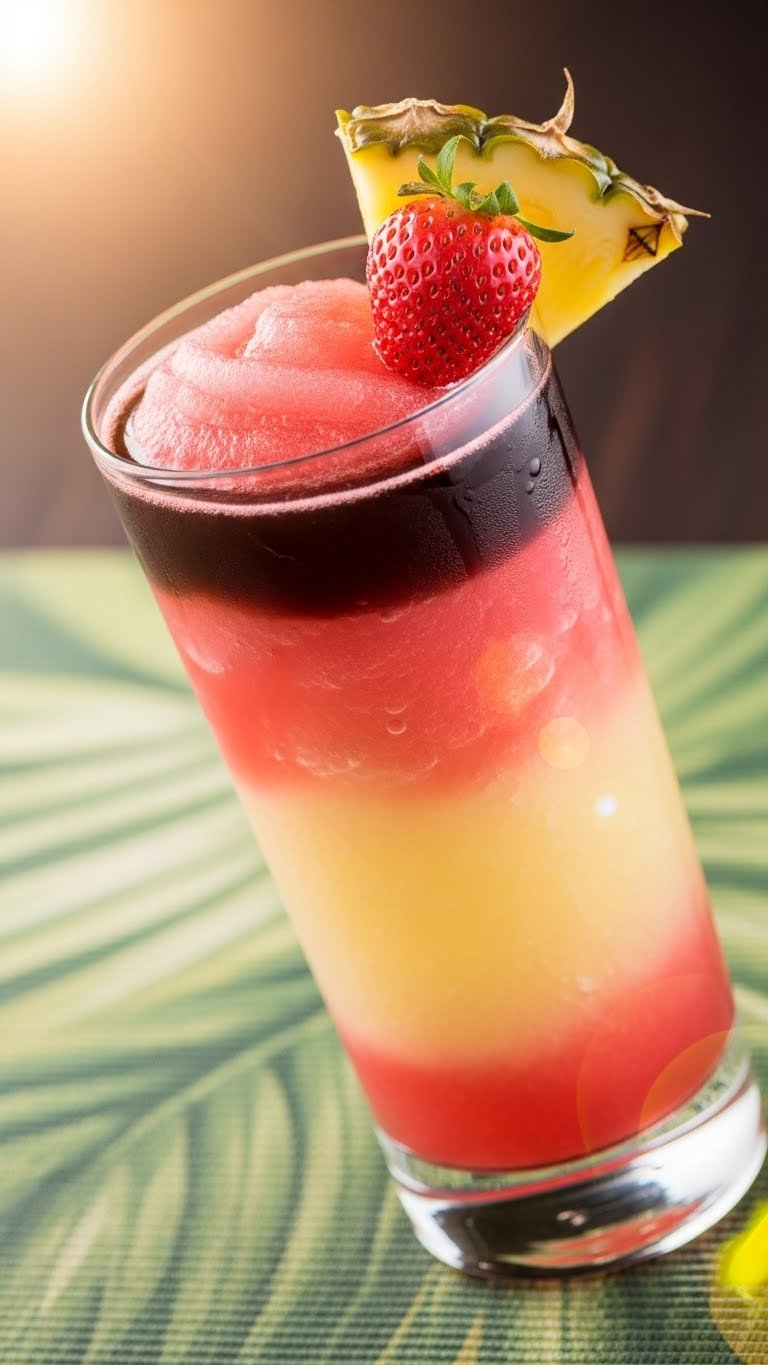Serve in hurricane or tiki glasses. Pair with jerk chicken or coconut rice. Store leftover base in freezer for 24 hours and reblend before serving. For a non-alcoholic float, use a splash of cola or iced tea.