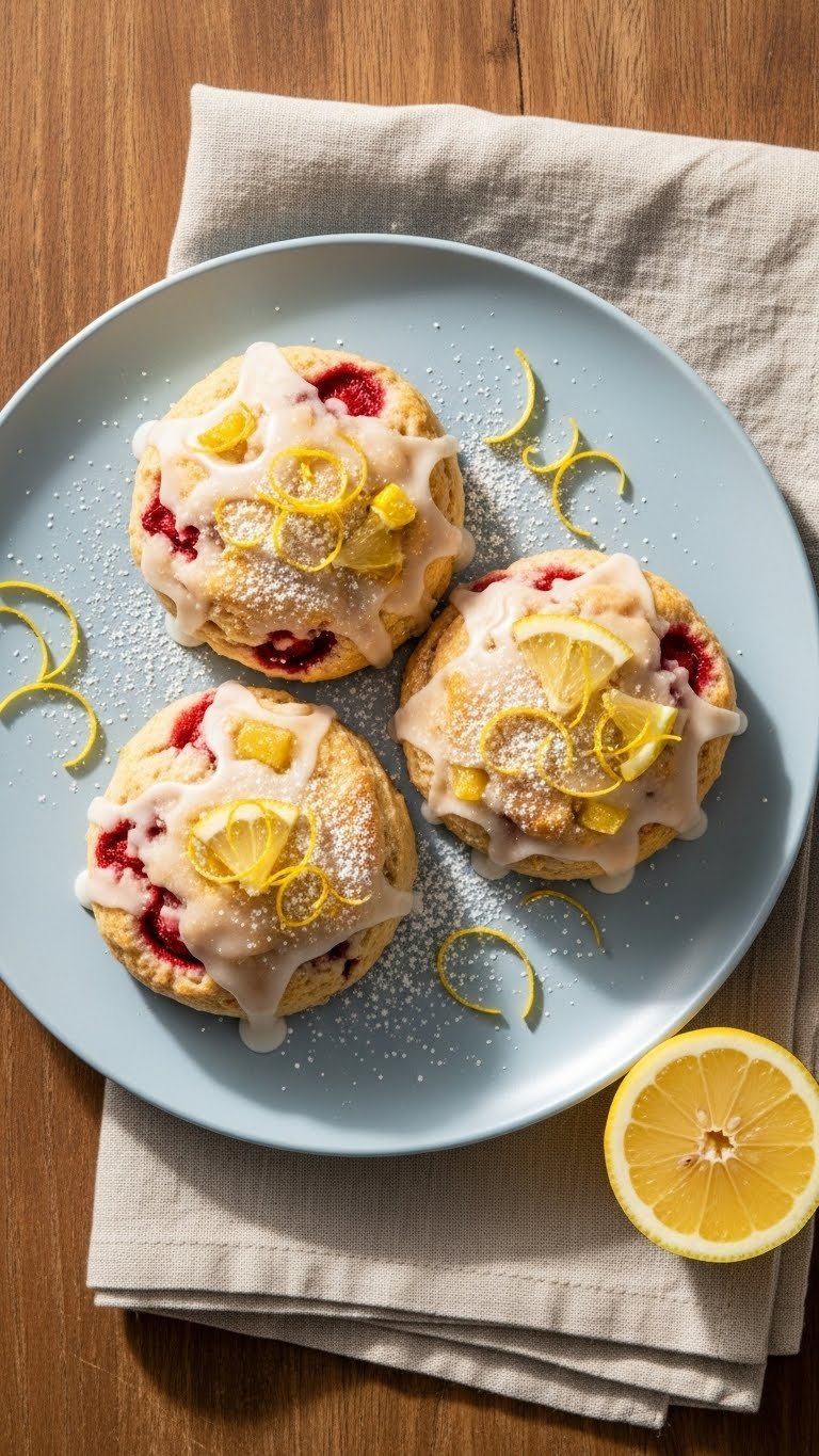 Plate with thin lemon slices and extra zest. Serve with chamomile tea or a chilled glass of Prosecco. Store in an airtight container for 2 days. For make-ahead, shape dough and freeze unbaked; bake from frozen, adding 3–5 minutes. Great for sunny brunches or bridal showers.