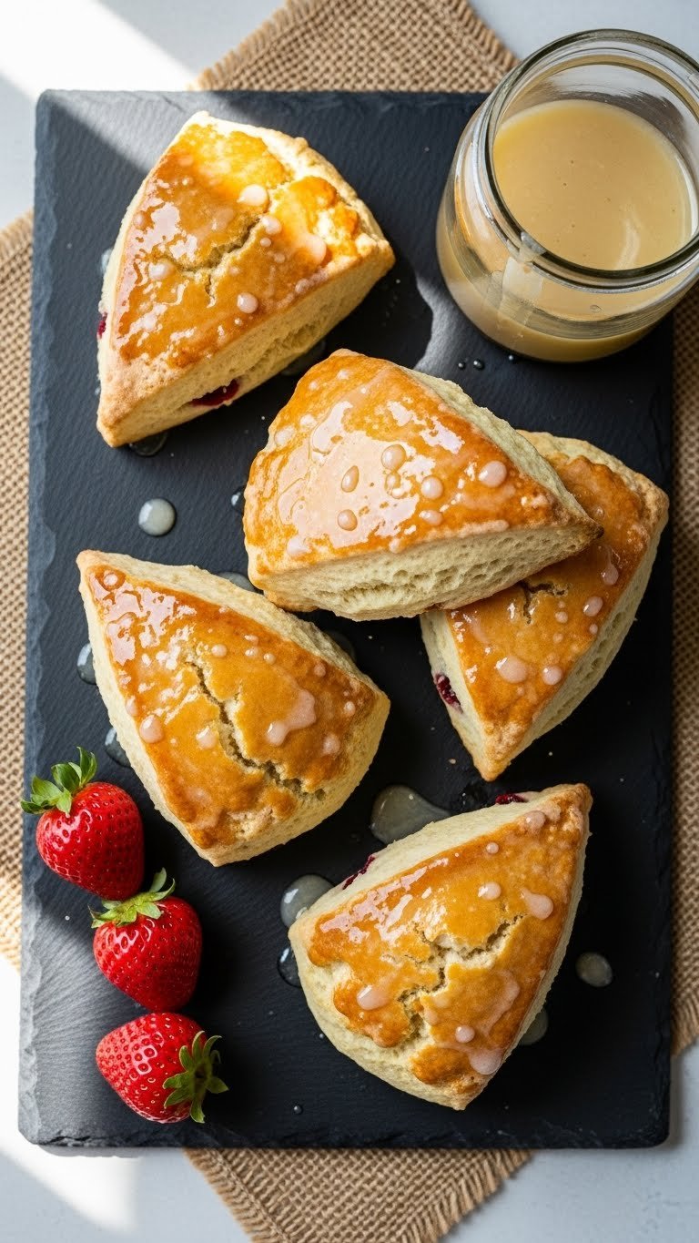 Arrange on a dark plate so the glaze shows. Top with a tiny slice of strawberry and microgreens. Serve with iced tea or a citrusy spritzer. Refrigerate glazed scones up to 2 days. Freeze unglazed dough for quick baking later. Great for weekend brunch or special occasions.