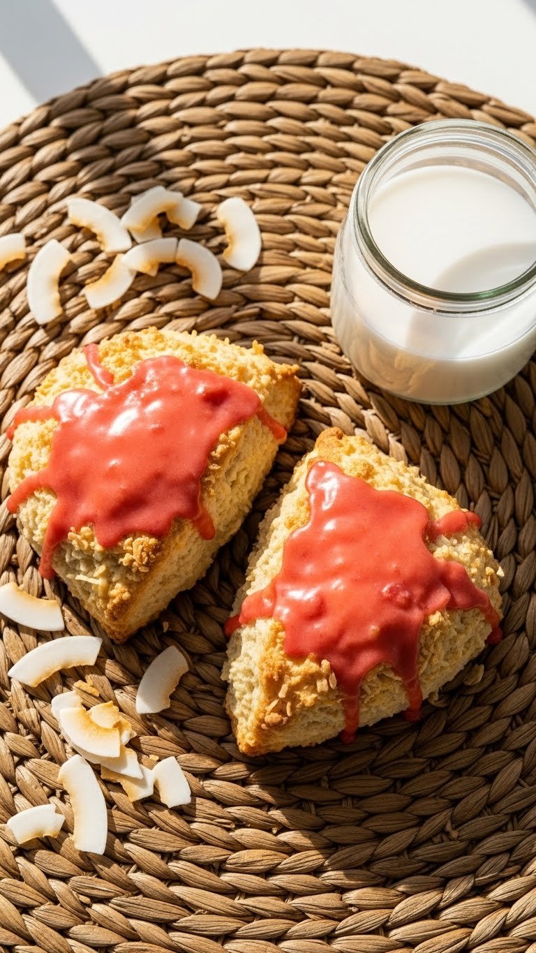 Serve with toasted coconut and thin strawberry slices. Pair with coconut latte or hibiscus tea. Store in an airtight container at room temp 1–2 days, or refrigerate for 3 days. Freeze unglazed scones for quick baking later. Perfect for vegan brunch menus.