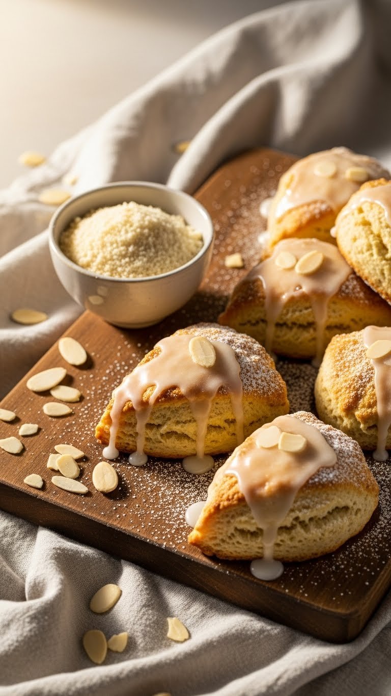 This gluten-free version uses almond and 1:1 GF flour for tender crumb. Scones stay moist and hold up to a glossy glaze. The almond notes pair beautifully with fresh strawberries.