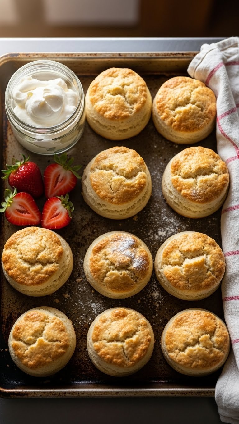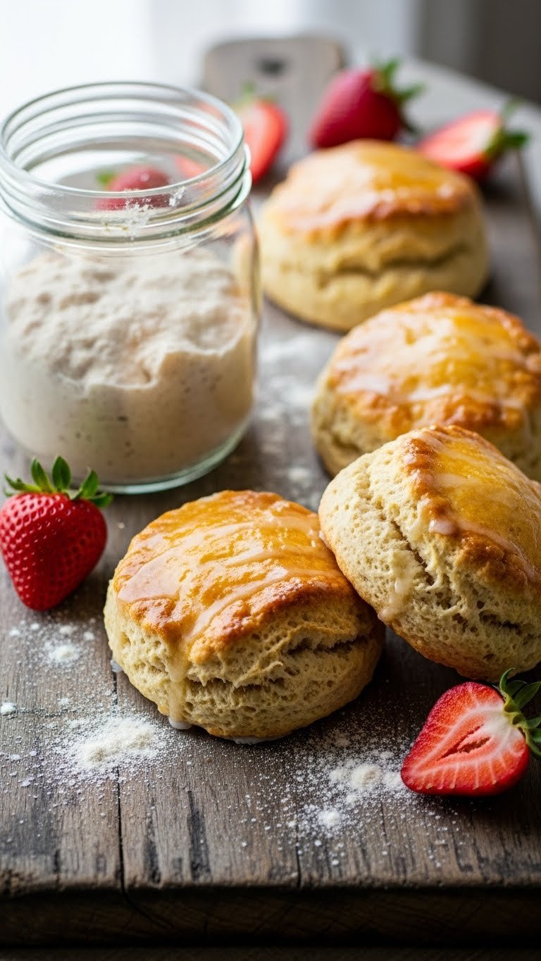 Serve with cultured butter or clotted cream and extra strawberry slices. Pair with black coffee or a robust breakfast tea. Store refrigerated up to 3 days because of starter. Freeze unglazed scones for longer storage. Lovely for bakers who keep starter active.