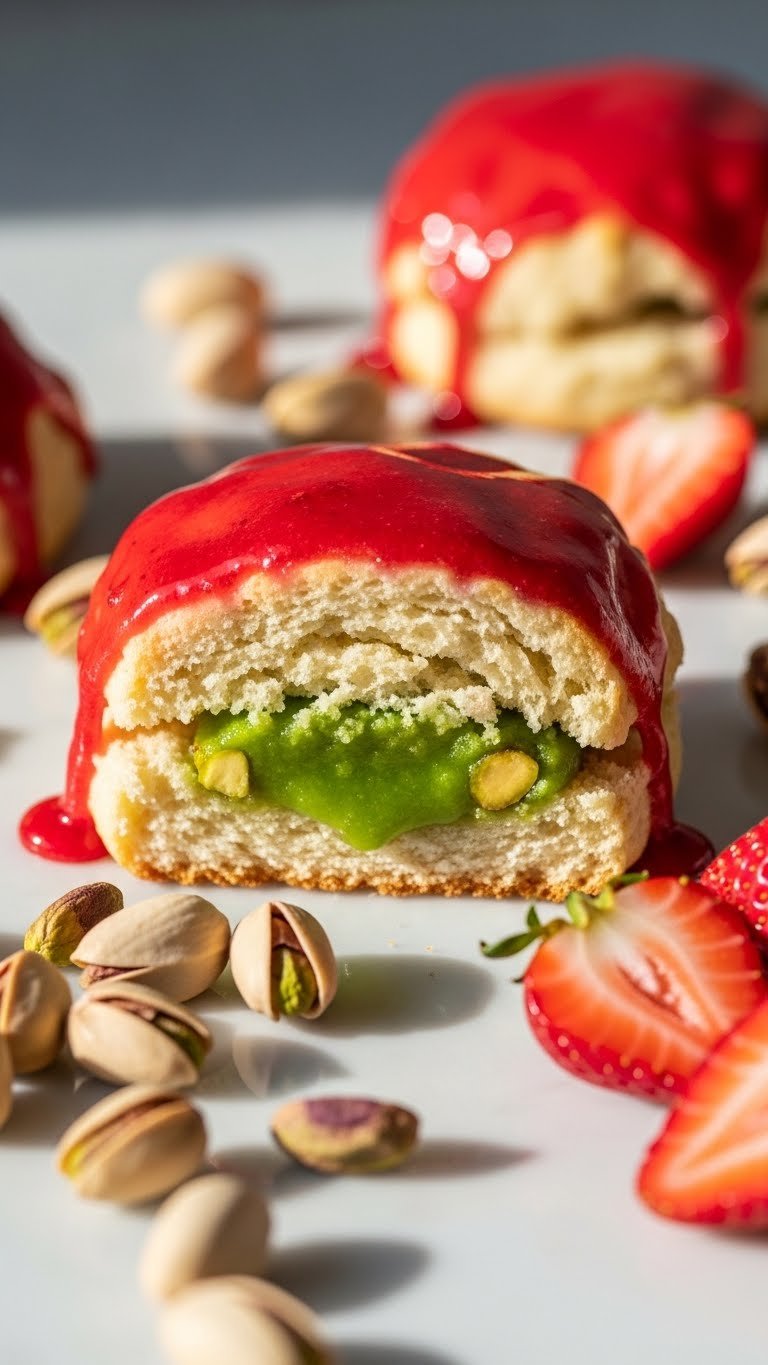 Slice open to show pistachio filling for dramatic plating. Garnish with crushed pistachios and a strawberry fan. Pair with espresso or almond milk latte. Store in airtight container 2 days; refrigerate for longer. These work well for celebratory brunches or dessert trays.