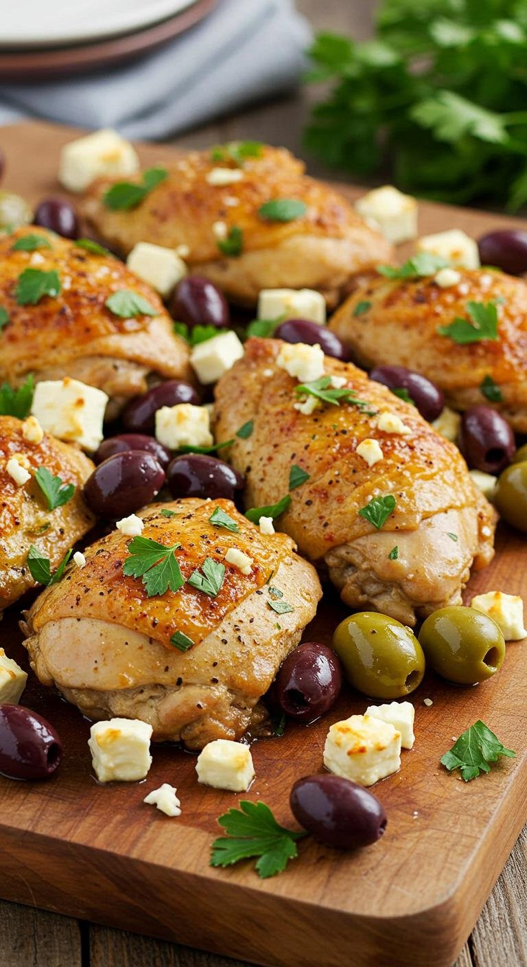 - Add tomatoes and olives around the chicken. Sprinkle with feta cheese.
