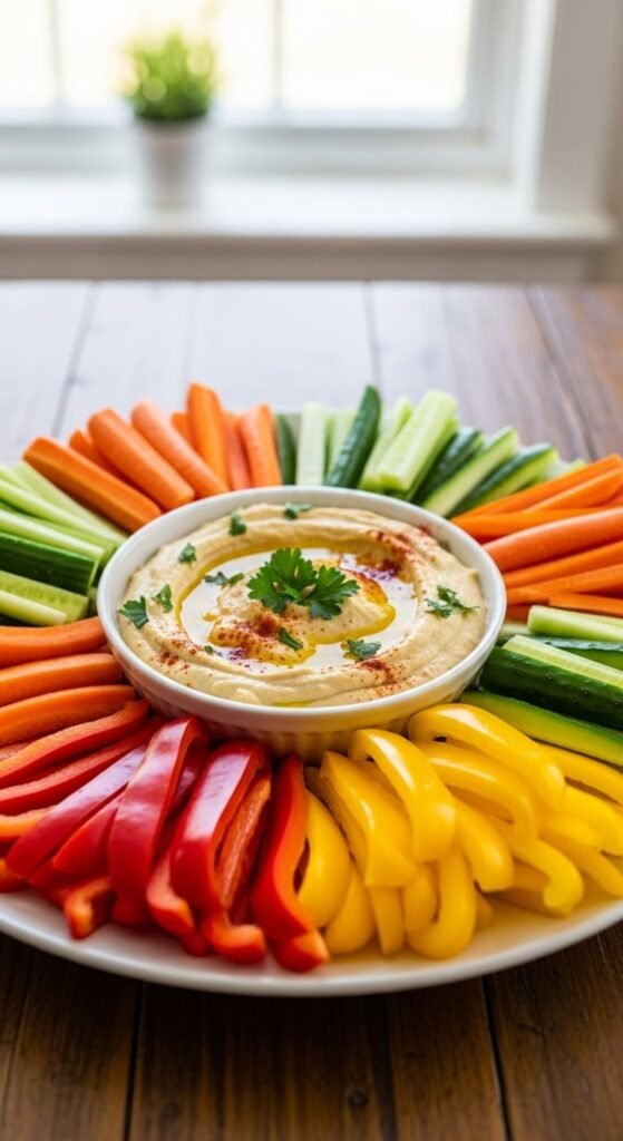 Snack on crunchy, colorful veggies paired with creamy hummus for a satisfying dip.