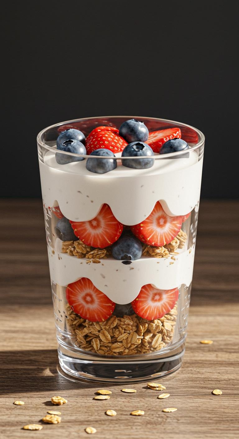 - In a glass, layer Greek yogurt, followed by mixed berries and granola.