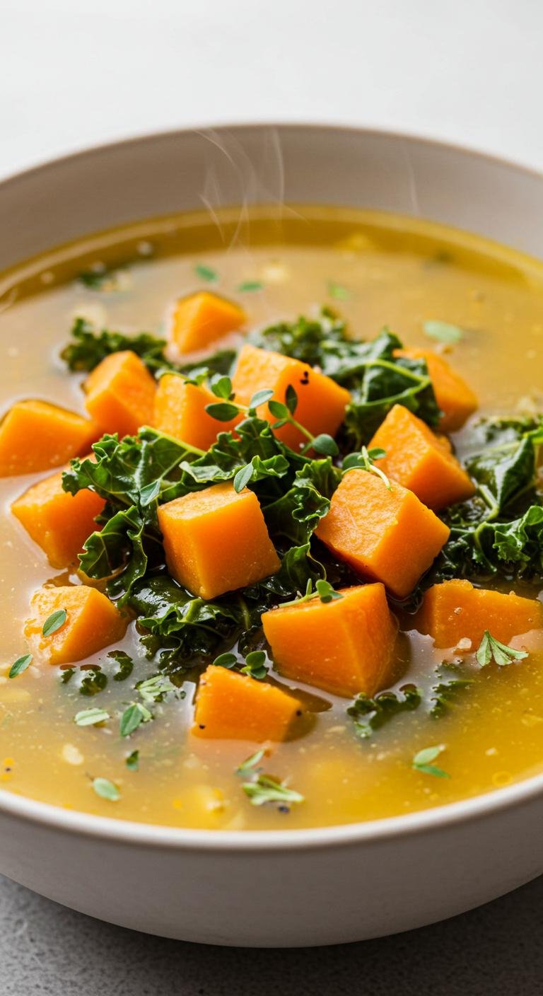 - Cook until sweet potatoes are tender, then stir in kale until wilted.