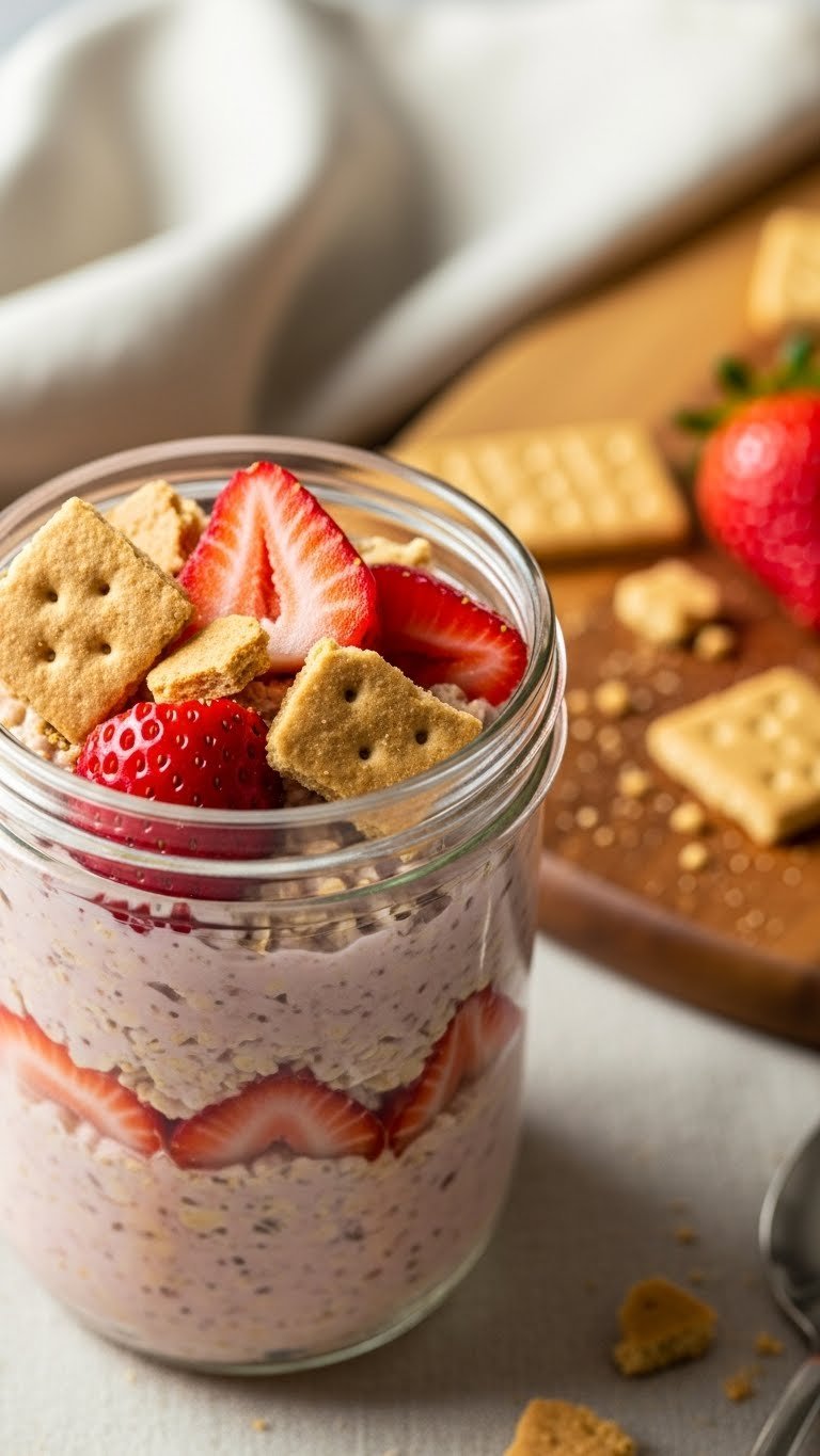 This classic recipe recreates the strawberry cheesecake flavor without baking. It’s creamy, tangy, and slightly sweet with crisp graham crumbs. You’ll love the texture contrast between smooth oats and crunchy topping. It’s perfect for busy weekdays or a slow weekend breakfast that still feels special. The smell of fresh strawberries and vanilla will make your kitchen feel cozy.